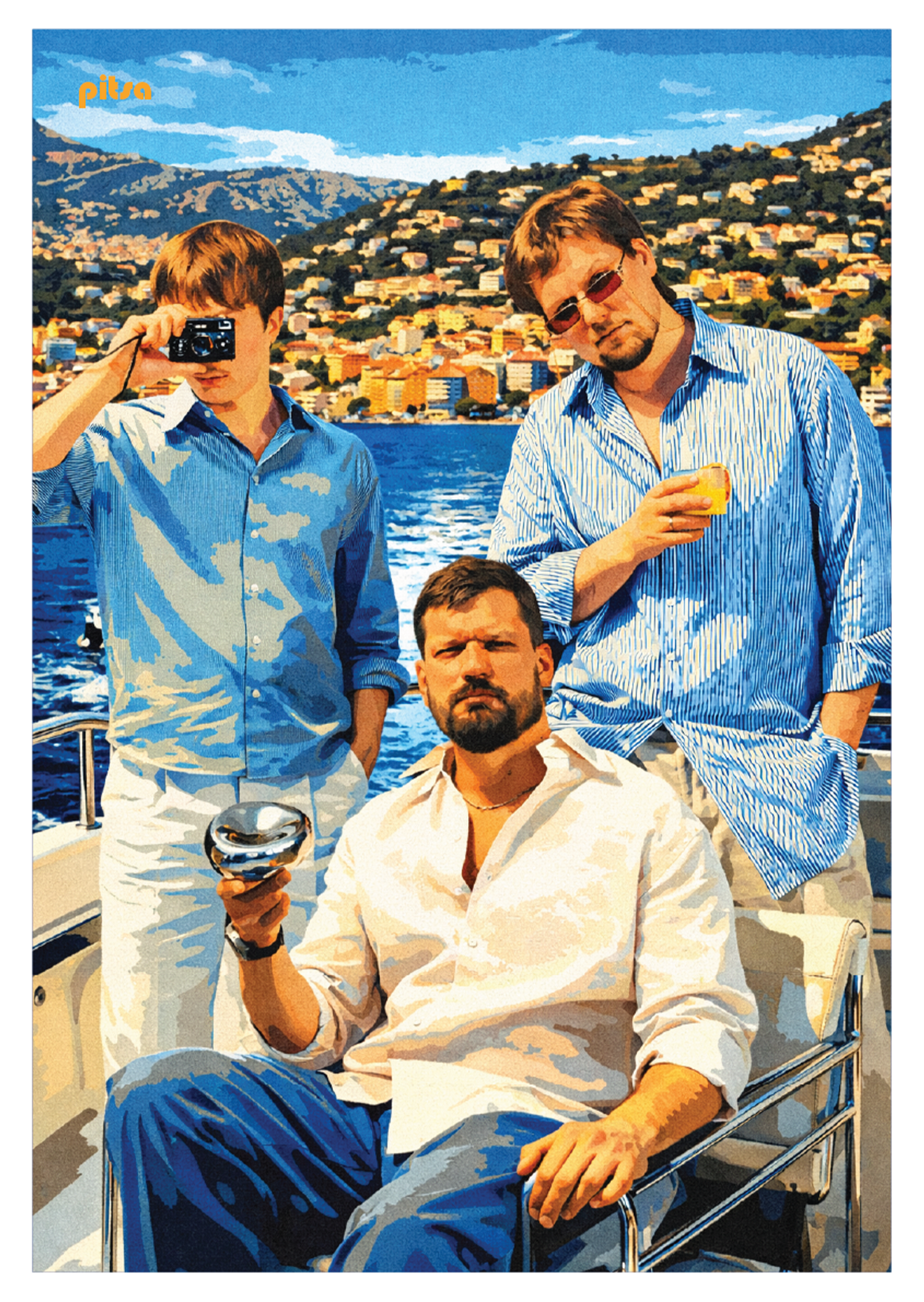 Kasuta selleks kolme mehe pildiga postkaarti.
